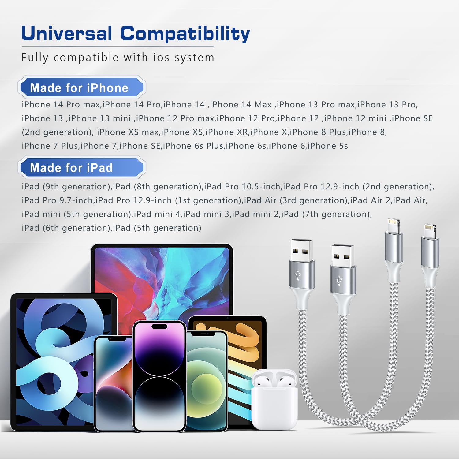 【Universal Compatibility】:2Pack iPhone charger cable with iPhone 14/13/12/11/11 Pro/11 Pro Max/XS/XS Max/XR/X/8 Plus/8/7 Plus /7/Sync 6s Plus/6s/6 Plus/6/5s/5c/5/iPad Air / Air 2 iPad Mini / Mini 2 / Mini 3 /Mini iPad Pro 10.5 inch / 12.9 inch / 9.7 inch / iPad Pro, iPod Touch 5th gen, iPod nano 7th Gen